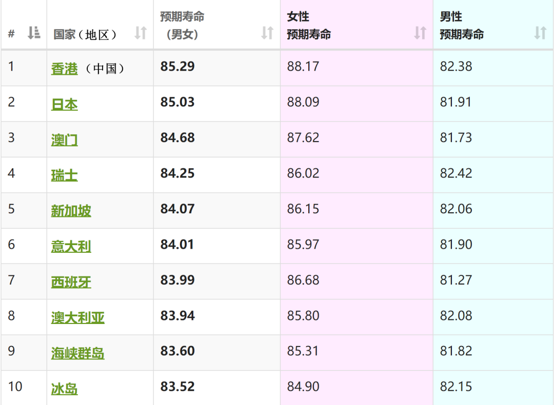 2021年《柳叶刀-公共卫生》刊文提到,自2013年以来,中国香港地区的预期寿命85.3岁,连续多年位列全球第一。2021年,根据上海市统计局数据,上海户籍人口平均预期寿命达到84.11岁。