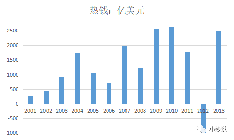 二战后日本发展,日元维持了三十年不变的低汇率,中国现在加入WTO才三年,就要人民币升值了。如此迫不及待,就是为了将来剪羊毛做准备。没有这一步,就没法剪到羊毛。为什么呢?假如一开始是8的汇率,我1美元进去,可以换8元人民币,如果汇率不变,8元换出来时还是1美元,但如果汇率升值到4,8元就可以换2美元。我1美元进去,啥都不用干,就可以2美元出来,这多余的1美元就是中国减少的外储。外储是中国人用一针一线的商品换来的国家存款,没有了外储,中国就无法在国际上购买石油、天然气等战略资源,也没法进行国际投资。2004年,中国外汇储备已经达到6000亿美元,占GDP30%。这笔财富十分庞大。在美国压力下,从2005年开始,人民开始升值。2005-2013年,人民币汇率从8.28升值到6.28,升值幅度24%。而从1995年开始,10年时间人民币汇率一直稳定在8.2左右。相比日本80年代三年升值50%,中国的人民币升值已经相当缓和了。热钱不是贸易带来的,而是出于投资目的的金融资金。那么2005-2013年,中国出现了多少热钱呢?外汇储备主要由两部分构成:贸易顺差和资本流入,国际上对贸易顺差的定义为:外汇储备增加量- 贸易顺差-外商直接投资 = 热钱。可以看到,2001-2013年,除了2012的非经济因素外,其余年份都是资本流入,没有资本流出,累计规模1.7万亿美元。