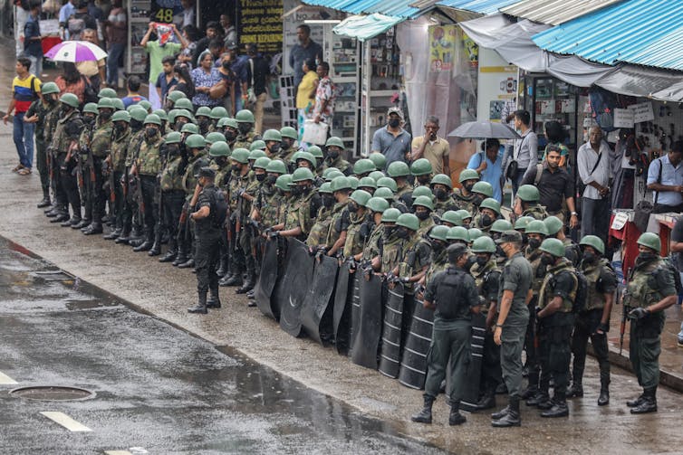 Soldiers block a road as workers protest against the government’s domestic debt restructuring process and proposed new labor laws in July 2023. Chamila Karunarathne/EPA