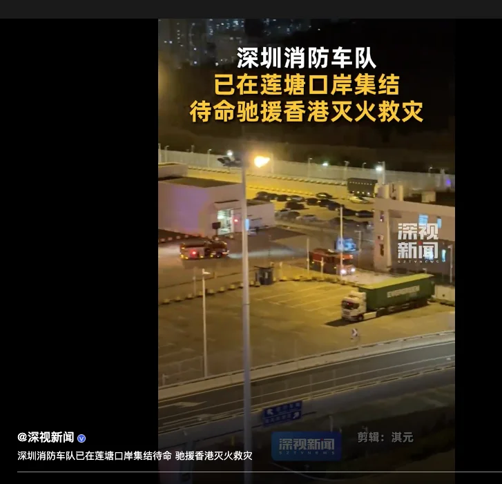 《深視新聞》在昨晚(26日)午夜11:26分,發布配上激勵音樂的影片,大字標題寫道「深圳消防車隊已在蓮塘口岸集結,待命馳援香港滅火救災」