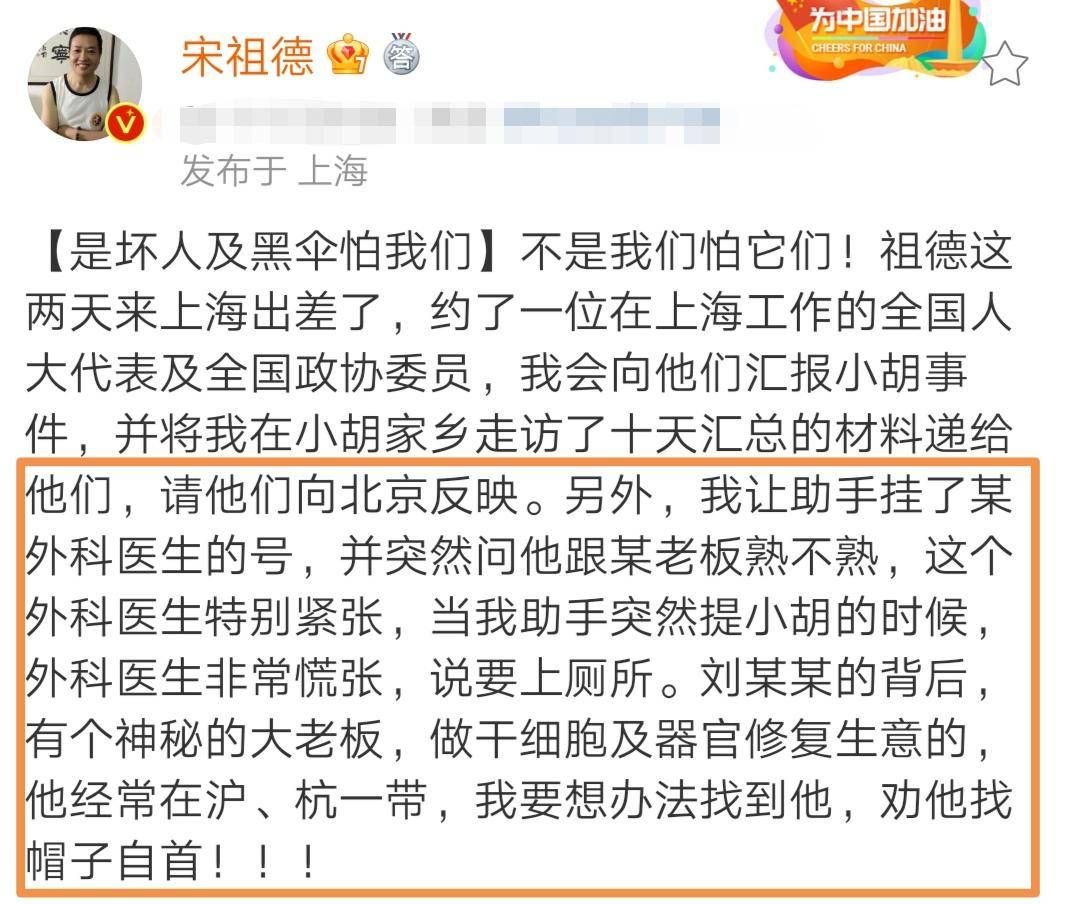随即,宋祖德还披露了他前两天遇到的一件事:“我让助手挂了某外科医生的号,并突然问他跟某老板熟不熟,这个外科医生特别紧张,当我助手突然提小胡的时候,外科医生非常慌张,说要上厕所。刘某某的背后,有个神秘的大老板,做干细胞及器官修复生意的,他经常在沪、杭一带,我要想办法找到他,劝他找帽子自首!”
