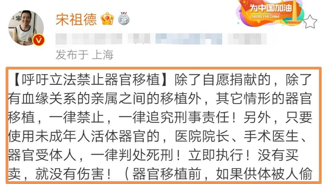 宋祖德通过社交平台谈到了器官移植这件事,他如是写到:“呼吁立法禁止器官移植!除了自愿捐献的,除了有血缘关系的亲属之间的移植外,其它情形的器官移植,一律禁止,一律追究刑事责任!另外,只要使用未成年人活体器官的,医院院长、手术医生、器官受体人,一律判处死刑!立即执行!没有买卖,就没有伤害!”