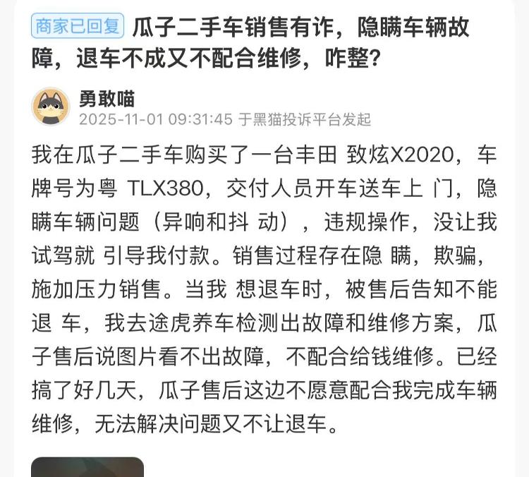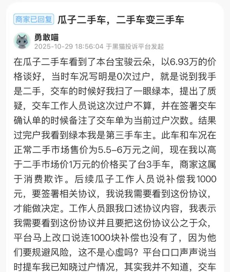 消费者在黑猫投诉 【下载黑猫投诉客户端】平台上对瓜子二手车的投诉内容