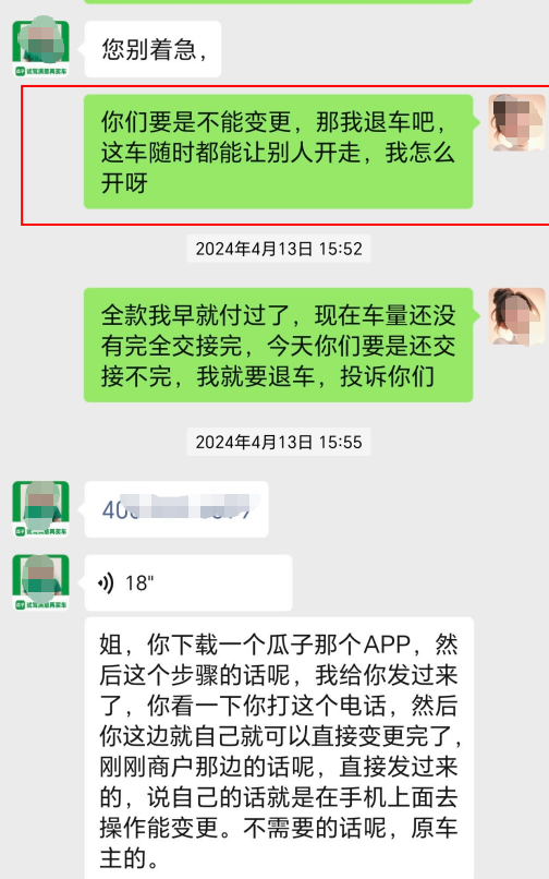 问题暴露后,金女士希望通过维权来找回属于自己的权利,但维权过程却困难重重。她多次联系瓜子二手车平台对接销售的梁女士,对方以“不负责售后”为由推诿,指引其联系400客服。但金女士多次拨打瓜子二手车400客服电话后,仅得到“已记录反馈”的敷衍回复,始终无人提供实质性解决方案。