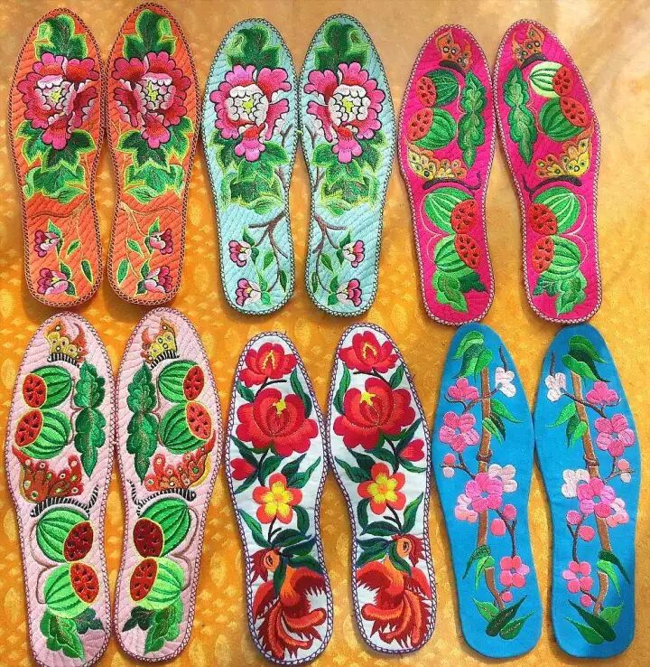 对啦,还有妈妈扎的花鞋垫,拿在手里沉甸甸的,这样的一双鞋垫要绣很久,穿上去好几年都不变形。