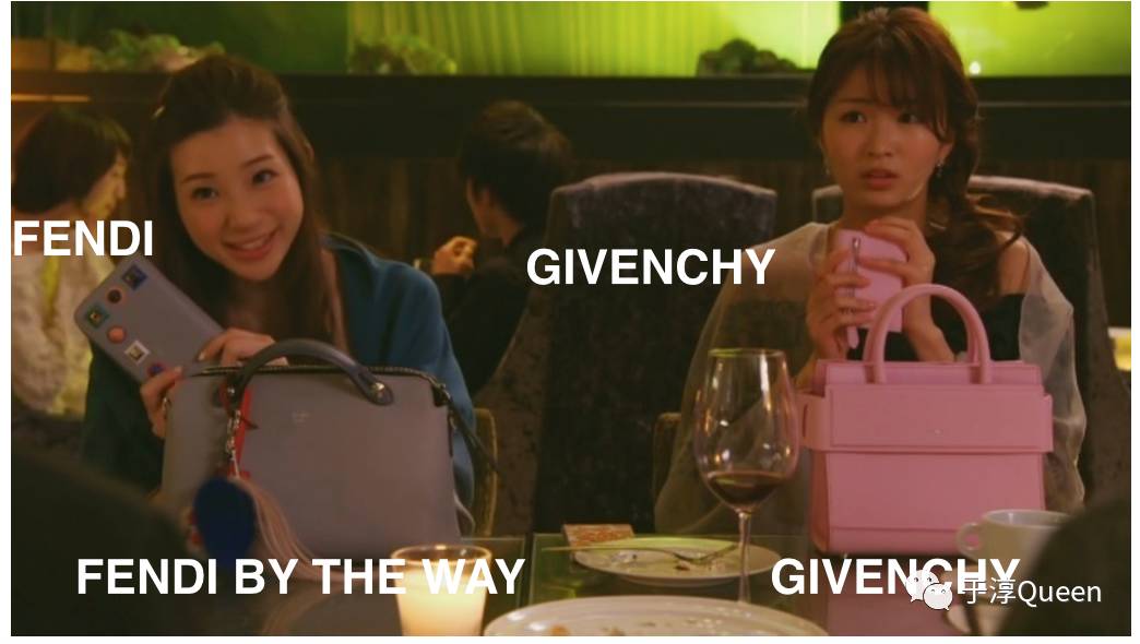 二人在联谊会上背的包包和钱包都遵循了同品牌同色系的原则,甚至梨花的包挂也是FENDI的MINI CHARM MONSTER BAG BUGS(其实我也是个有原则的人,可那个毛球儿抵上一个包了好嘛?????)。