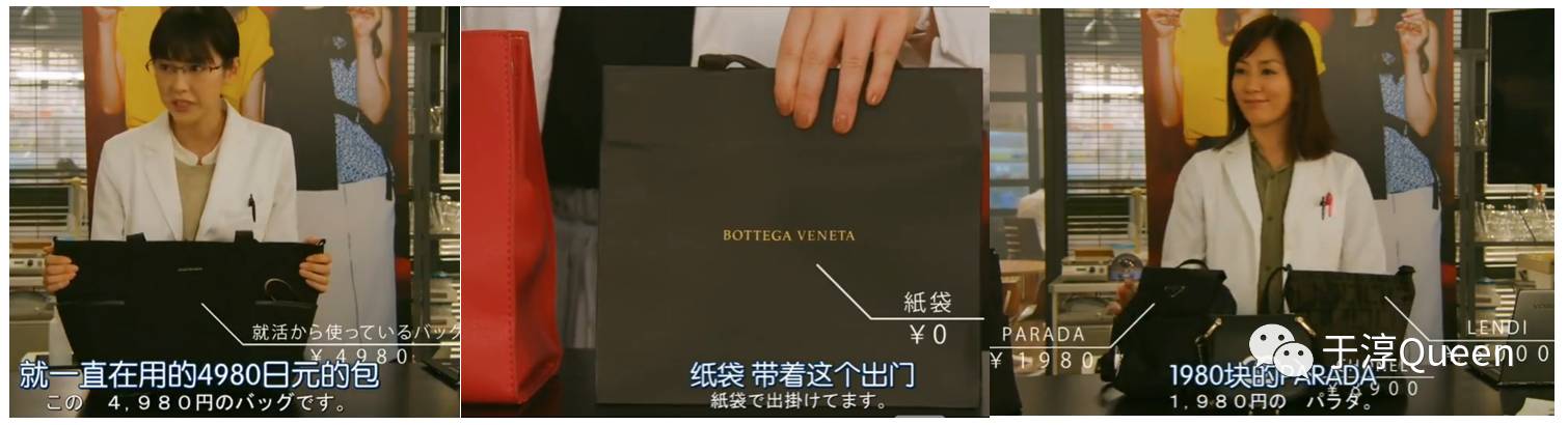 三位“拟女人”的包包是这样滴: 女主的不到5000日元……从面试参加工作到现在……缝缝补补又三年的大黑包,胖妹的专门应付大场面的……Bottega Veneta……的纸袋,热衷名牌的……满子的远低于义乌ISO水准的……PARADA/LENDI/CHONEL。