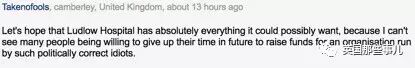 “让我们一起来期待Ludlow医院能得到一切他们想要的吧,因为我相信在未来不会再有多少人愿意为了这个由政治正确的傻子运营的机构浪费时间去筹款了。”