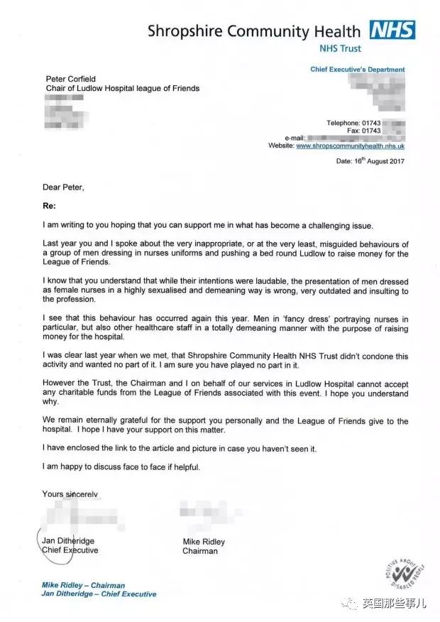 而什罗普郡社区NHS信托机构的首席执行官Jan Ditheridge却在信中表示: