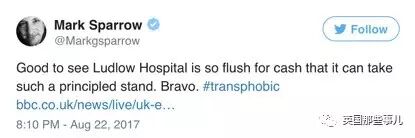 “很高兴看到Ludlow医院现金如此充裕,可以采取这样的原则立场。厉害哦。#跨性别恐惧症”