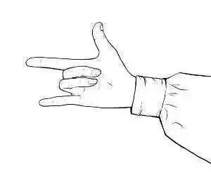 拇指伸直外张,食指、小指伸直,中指、无名指弯曲内扣。