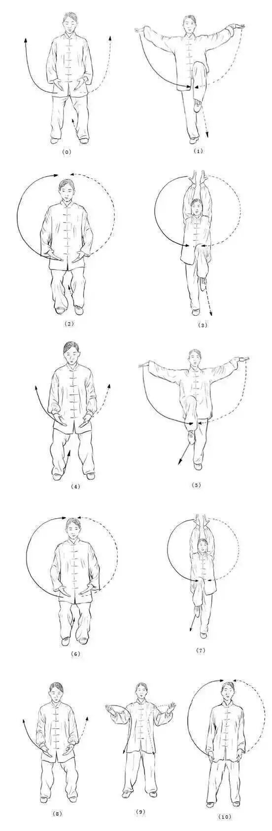 两臂的上下运动可改变胸腔容积,若配合呼吸运动可起到按摩心肺作用,增强血氧交换能力;提膝独立,可提高人体平衡。