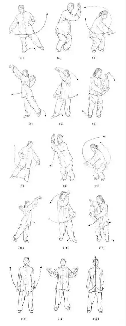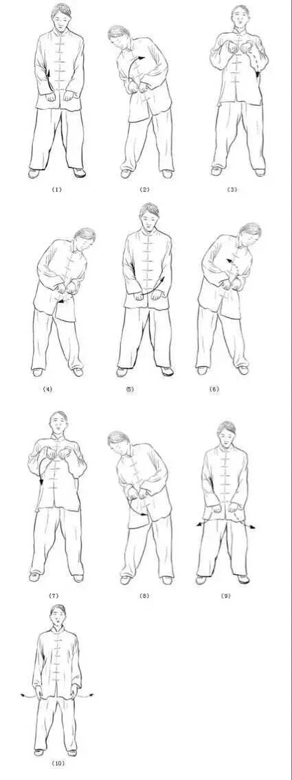 重复一至四动三遍后,两手自然垂于体侧;目视前方。