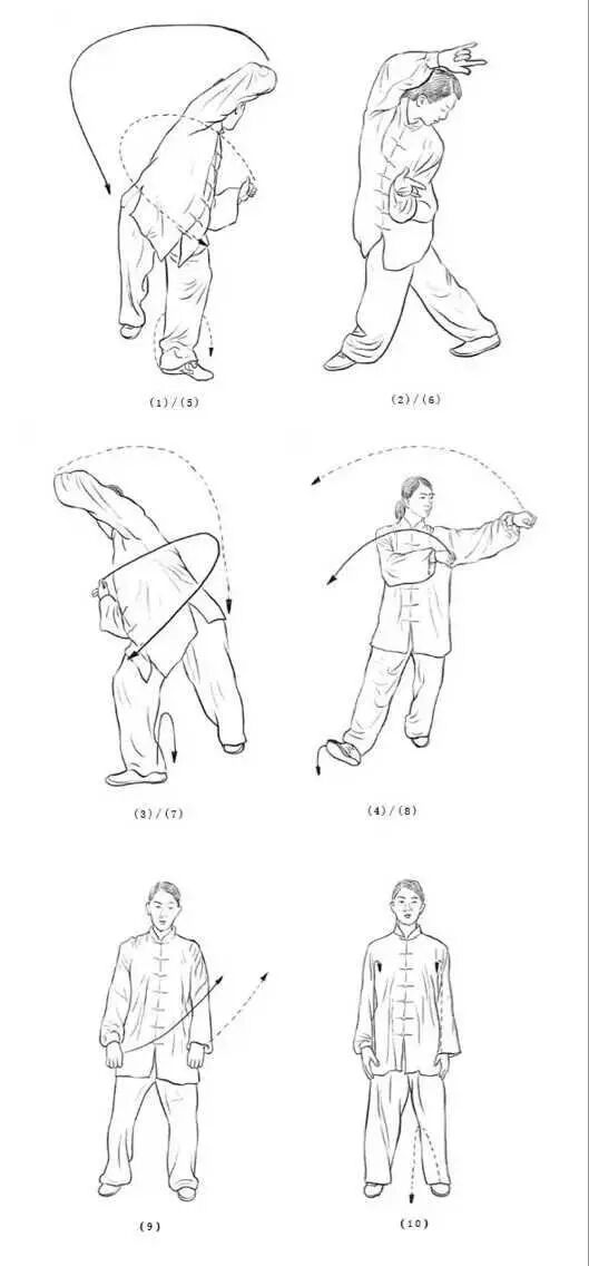 动作五至动作八:同动作一至动作四,惟左右相反,上体做逆时针摇晃,两拳随之画圆。