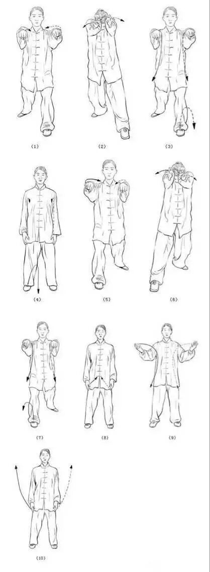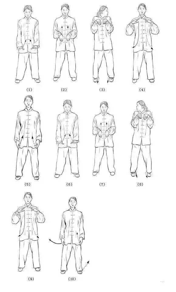 重复一至八动作一遍后,左脚下落,两脚开步站立,两手自然垂于体侧;目视前方。