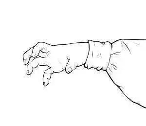 五指张开,虎口撑圆,第一、二指关节弯曲内扣。