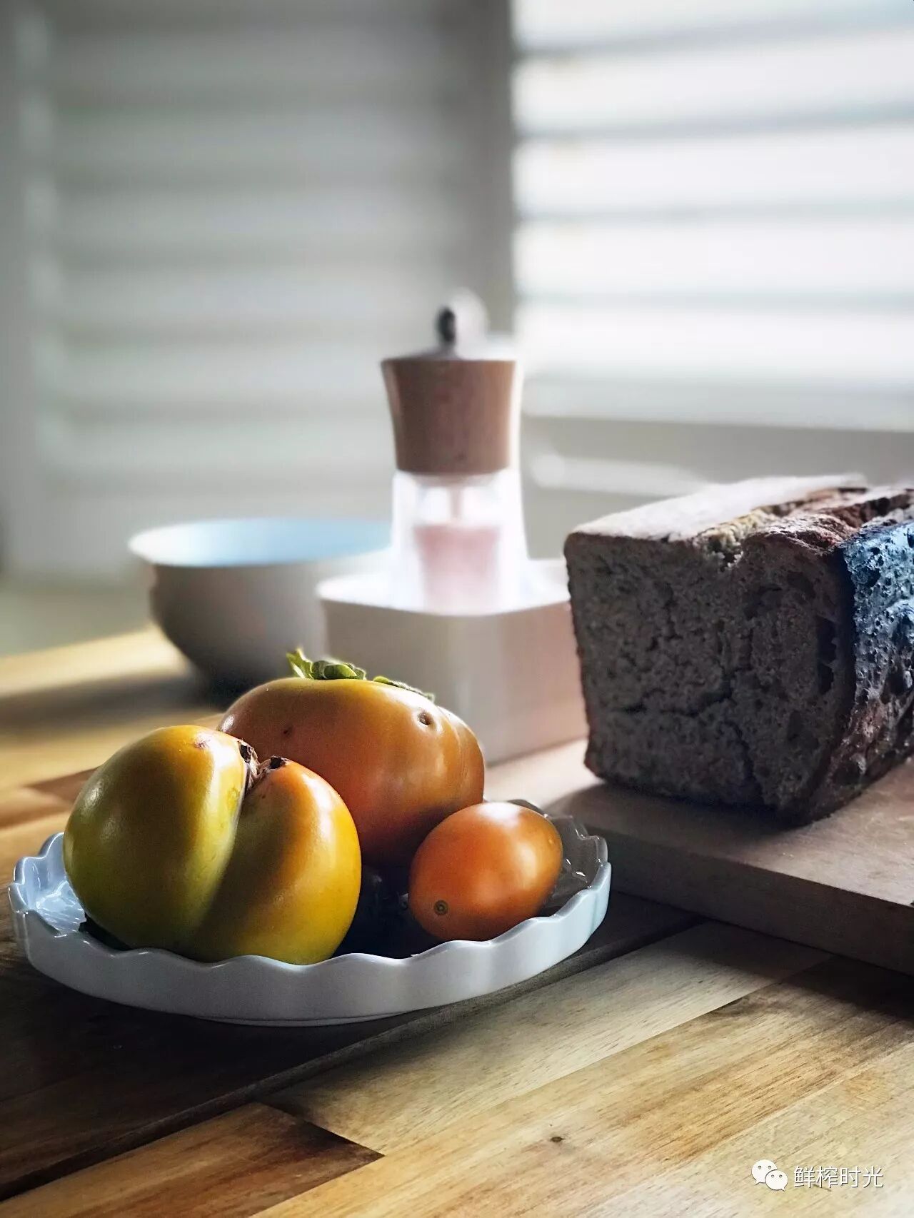 进门瞬间我有种奇异的松弛感,仿佛心中有什么悬垂已久,猛地落地、安然。地板是原木的,未经涂漆打蜡,光泽温润,触目暖心,是男主人作品。天花板是拱顶,很高,木板铺的,两端各有黑色实木的横梁。一个老式吊扇静静在正中俯瞰。客厅很空旷,靠墙站只铁炉,战国时代刀叉剑戟的蓝,花纹精致,以一种复古的气质为全屋定下调子。两只沙发静静蜷在客厅尽头,一横一竖,仿佛在为空间让路。客厅另一头,靠近厨房的墙边,横着张原木餐桌,色泽明亮,棕黄交错,纹理赫然。桌子很长很敦实,正中一个托盘,盘里放着十来个日本柿子,在晨光冲洗下,色泽纯正如同橘的理念。另有一只宋瓷风格的白瓷盘,里面三只扁柿子,光泽如蜜蜡。盘边一块木板,板上一条全麦面包。又一个造型古朴的瓶子,里面装的不知什么。衬着背后的白百叶窗,是极好的一组静物。