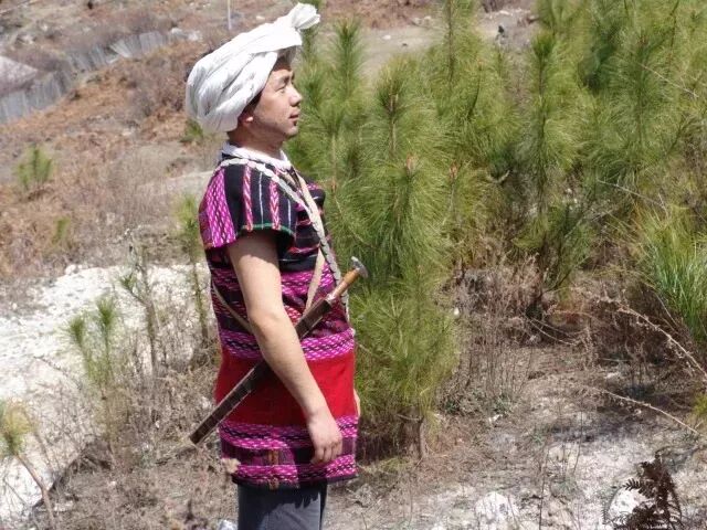 部落里的男子头上盘黑帕,带银耳环,穿长到膝盖的坎肩,裆部只用一条褡裢遮羞,挎五六十厘米长的砍刀,十分威武。