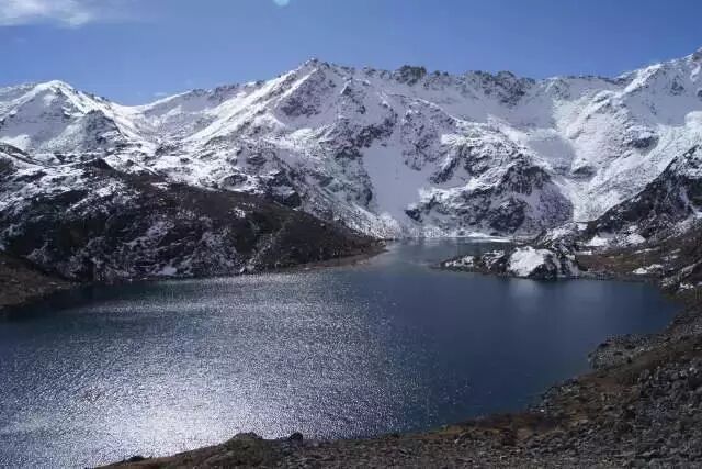 雪山照映得湖水银光闪闪,蓝的让人忘却烦恼。