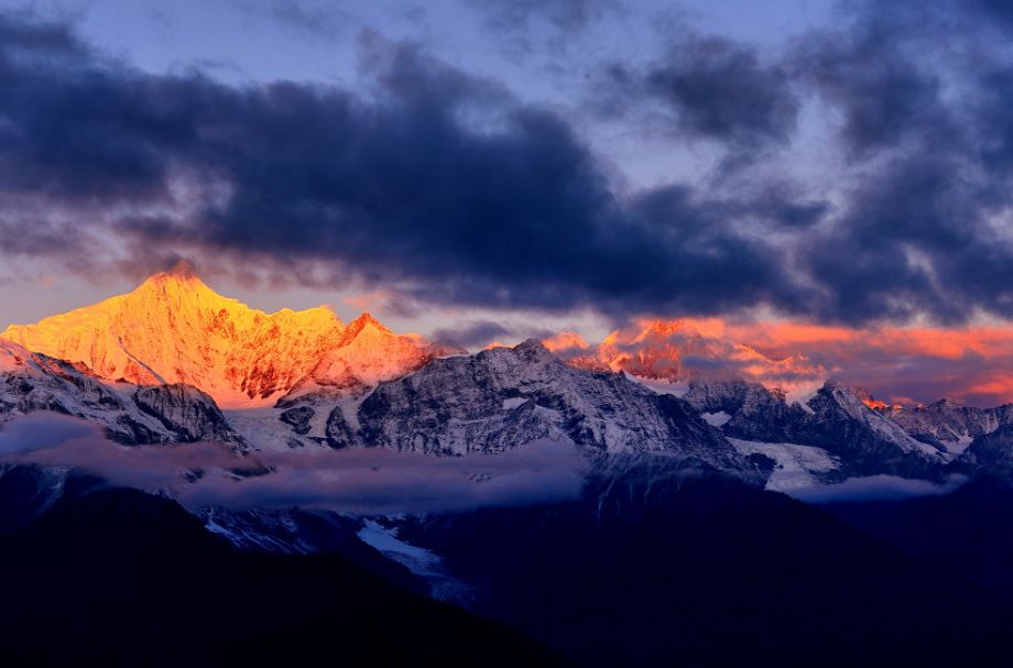 沿丙察察线从察瓦龙前往察隅,最值得期待的景观就是梅里雪山。雪山山峰一字排开,像一群威严的狮子,凛然站立。