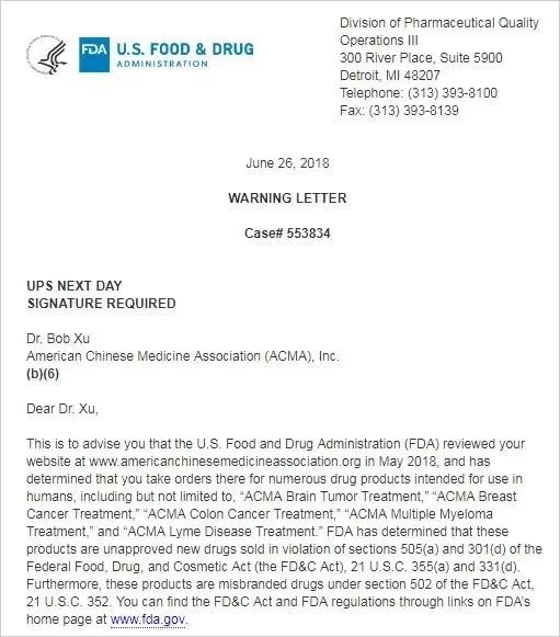 2018年6月26日美国食品药品监督管理局(FDA)向美国中医学会主席Dr. Bob Xu发了一封警告信: