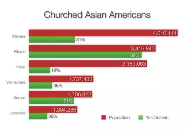 (各亚裔人口中去教堂者的比例,来源:Christianity Today: 9 Things About AsianAmerican Christianity http://www.christianitytoday.com/edstetzer/2013/november/9-things-about-asian-american-christianity.html)
