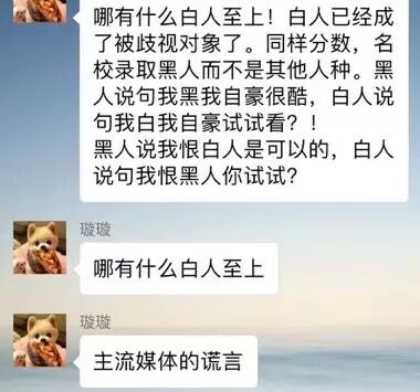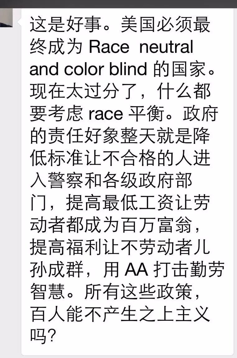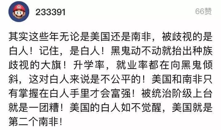 “被歧视的是白人!记住!”,“美国只有掌握在白人手里才会富强!被统治阶级上台就是一团糟!”喂,我们不是白人耶,所以应该乖乖当被统治阶级对不对?永远。。。永远。。。居然还有66个赞。。。