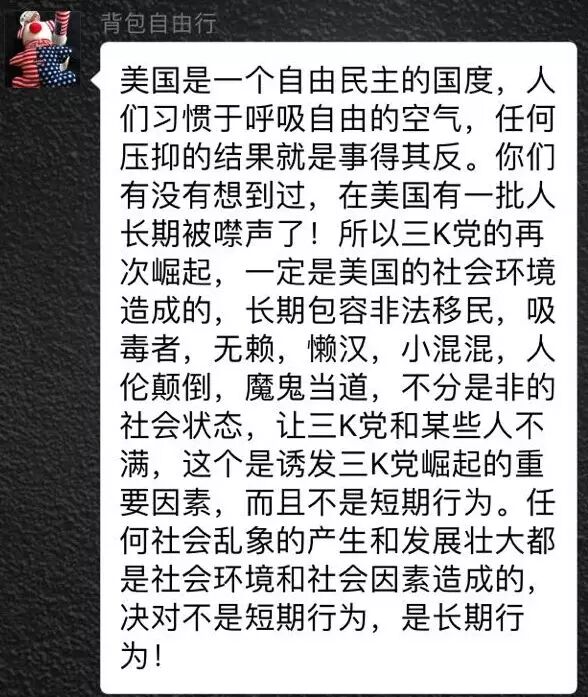 这位是著名挺川公众号“美国华人之声”的知名写手“背包客自由行”,以谴责被美联航暴打的陶医生“不守规矩”而出道。所以3K党的再次崛起是因为他们被长期噤声了?照她的意思3K党不该被噤声?