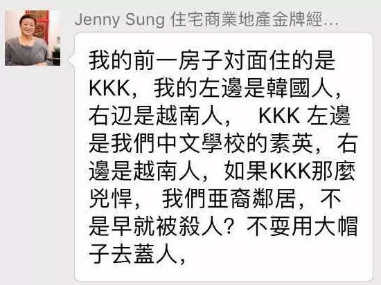 来,看看这位的逻辑。因为我家邻居是KKK,而我们都还活得好好的,所以KKK并不凶悍。也没有可能他是因为讨厌你们这些“外国人”加入KKK的呢?