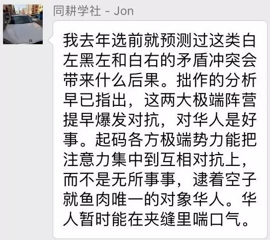 这位觉得左右极端阵营打起来对华人是好事,真的不得不佩服他从危机中看到契机的本领。