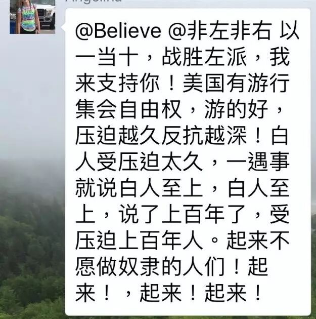 这位Angelina是最活跃的,在很多群连篇累牍的刷屏,超同情的,认为白人是因为被压迫上百年才不得不出来反抗。“起来!起来!”推荐下次3K党游行的时候你去扛大旗、打头阵。