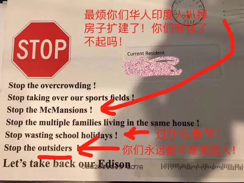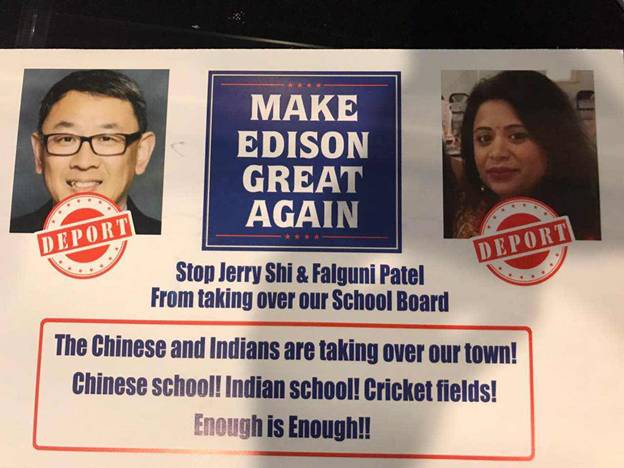 刚刚,吐槽君接到新泽西华人同胞爆料,该州爱迪生(Edison)市将举行学区委员选举,有人散发竞选宣传卡片,口号“Make Edison Great Again”,鼓吹把两名亚裔候选人遣返(deport),还说受够了中国人和印度人。这两位被点名攻击的候选人之一是华裔施景渭(Jerry Shi),另一位是印度裔。