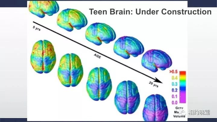国家精神健康研究院总结: 大脑成熟的顺序从后向前, 是脑神经被髓鞘包裹的过程。神经只有被髓鞘包裹好后它的信号才能最快地传导到目的地。