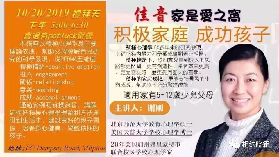 2020年元月19日,谢刚老师将会在基督五家举办另一场亲子讲座,欢迎大家届时参加。