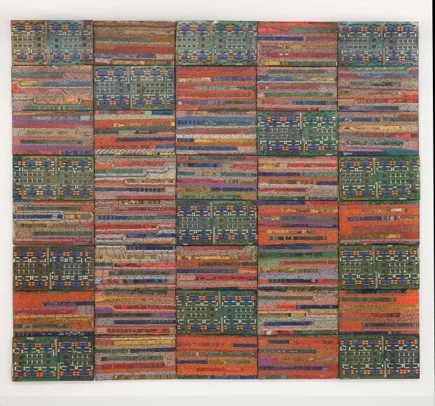在这幅画里, 很难看出这是由电线和元件构成的。埃利亚斯·西姆是一位埃塞俄比亚艺术家,他用自己的系统网格来描述其中复杂的叙述。