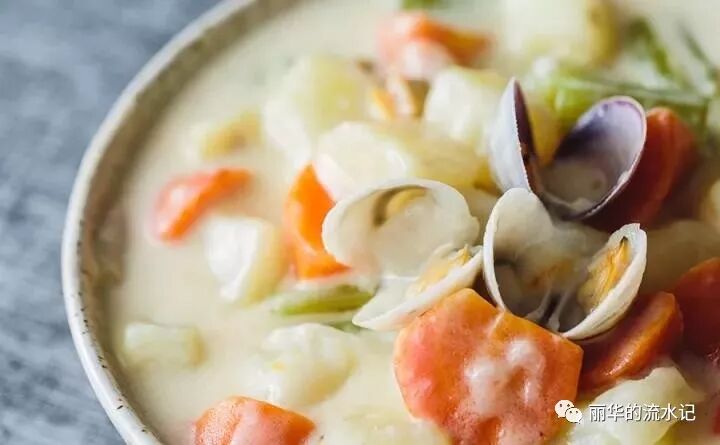 原料有鸡汤、黄油、面粉、土豆、海鲜,牛奶、奶油……