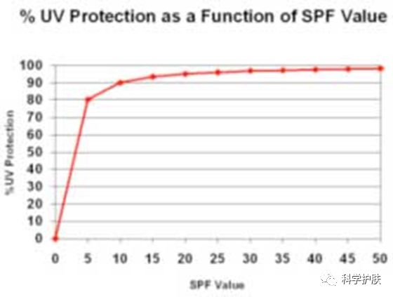 从这个统计表(图二)中,我们可以看出:SPF在15时已经达到了对皮肤90%以上的防紫外保护,SPF在50时比15的保护能力强,但并不强太多。因此,我们并不一定要选择SPF特高的防晒产品。
