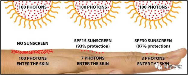 当我们购买防晒产品时,一般都会注意其防晒系数(Sun Protection Factor,SPF)。 SPF是一个衡量其防晒能力的指标。美国FDA规定所有的防晒产品必须通过测试才能标识其SPF值。SPF值是怎么测出来的呢?主要是通过检测防晒品保护皮肤不被UVB晒伤的能力而得来的。假设一个人不用任何防晒品,60分钟会被晒伤;那么在同样的太阳光强度下,如果正确使用SPF20的防晒品,她(他)则需要60*20=1200分钟才能晒伤。SPF值越高,一般代表着它的防晒能力越强 ,但SPF值与其防晒能力并不呈线性正相关的关系。也就是说,SPF30的防晒能力并不是SPF15的2倍。从下图一可以看出:如果在没有使用防晒产品时, 皮肤吸收了100 Photons 紫外线,那么在使用SPF15的防晒产品时,皮肤只吸收了7 Photons UV, SPF30只吸收了3 Photons UV。