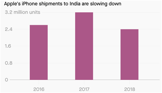 2018年,苹果手机在印度市场的销售额同比下降17%,且主要集中于低端苹果产线,超过一半的销售额来自于 8之前的版本。