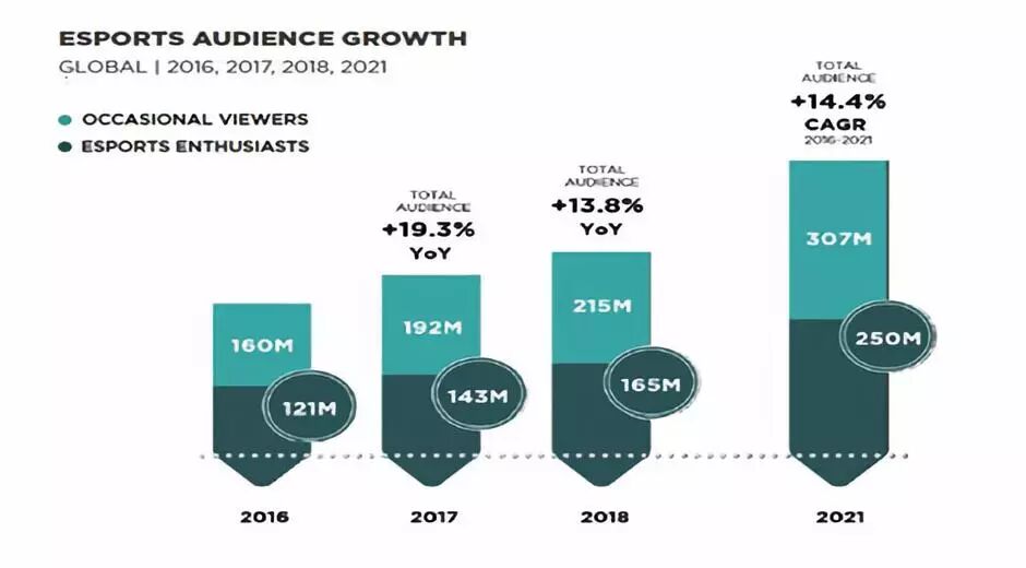 2018年全球电竞观众总量将达到3.8亿,同比去年增长了13.8%。其中,深度用户为1.65亿占比43.4%,轻度用户为2.15亿占比56.6%,到2021年,全球电竞观众总量将达到5.57亿。