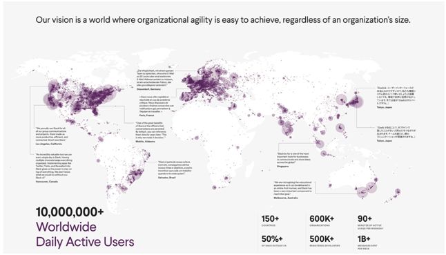 Slack成立于2014年2月,从当初一个只有1.5万个用户的办公室交流软件,发展到如今有超过1000万的日活跃用户和8.8万的付费企业用户。Slack目前的估值在70亿美元左右。从2014年到2019年,这5年来Slack不仅在企业协作软件领域一直保持第一位,本次的上市计划更是为Slack走向国际化铺平了道路。