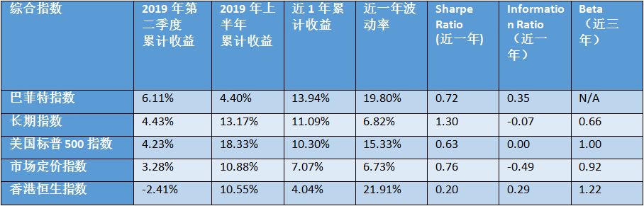由于美国整体市场的波动,2019年第二季度各指数涨幅均为单位数,但其中5支指数跑赢大盘,且所有指数上半年累计收益均在15%以上。由于所有指数收益偏低,波动率变高,夏普比率表现欠佳。