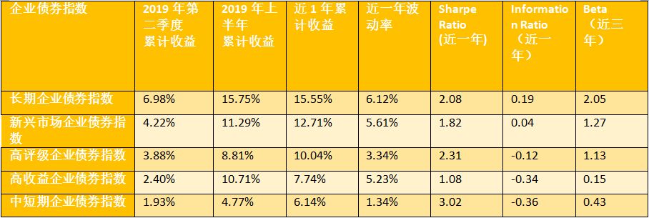 长期企业债券指数为第二季度,2019上半年和近一年表现最好的指数。