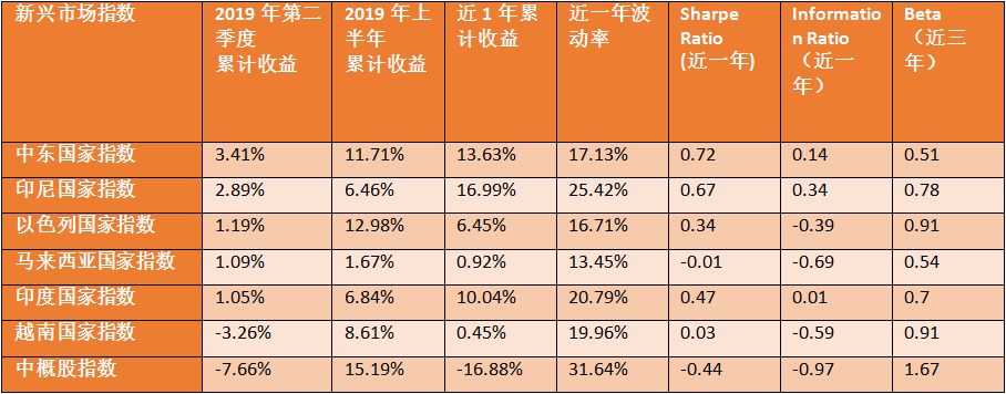 新兴市场中,中东国家指数表现最好,同时也为新兴市场板块中近一年表现最好,夏普比率最高的指数。美国与伊朗的争端并没有过多影响中东市场,反而引起了油价的上涨。