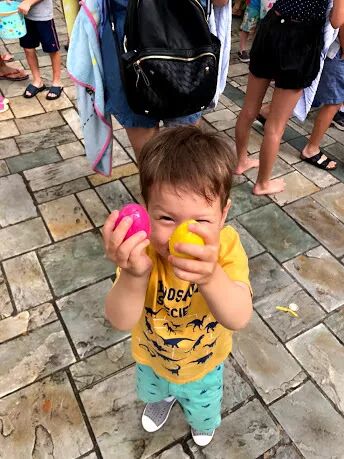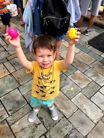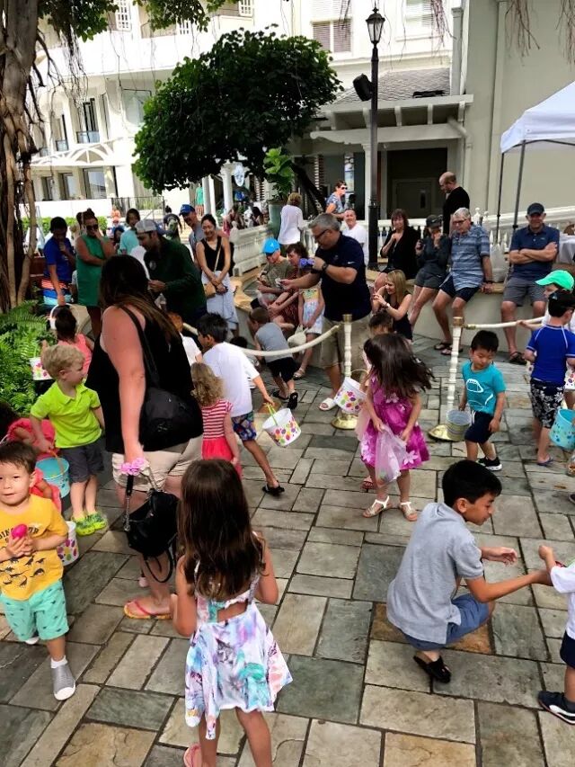 Moana Surfrider 同时也有专为孩子们提供的很多活动。这是一个刚好赶上复活节周末,酒店有不少孩子们,小朋友们一起进行复活节找彩蛋的节目。 小j很兴奋地展示他找到的彩蛋。