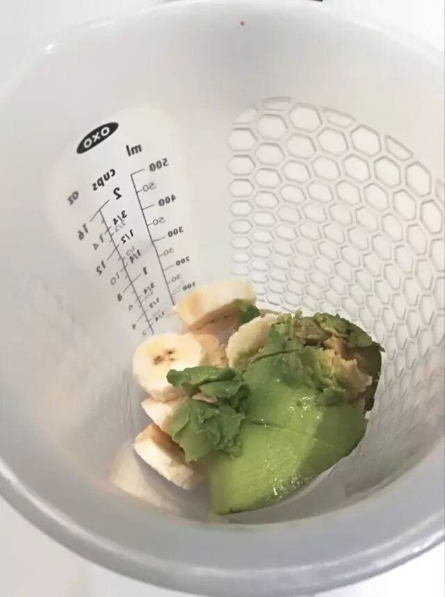 我自制的蔬果酱由三个主要成分组成;牛油果,香蕉和蒸蔬菜。成熟的牛油果口感很绵密且营养丰富。并能提供了中性密集的热量。香蕉含钾,纤维,并带有一点甜味。除了牛油果和香蕉之外,可以随意添加各种蒸蔬菜。如南瓜,红薯.再加入适量的牛奶,用搅拌棍混合搅拌均匀至泥状。所有成分都是有机的。