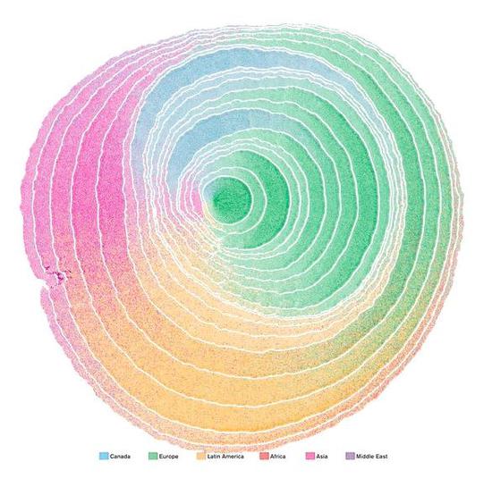 Visualcapitalist的专栏作家Ghosh设计过一个年轮来展示美国的移民历史,这张年轮图也获得了2018 Kantar美丽数据大奖的“人、语言&身份”单元金奖。Iman Ghosh表示,他指出,美国的移民潮大致可以按照人口来源分成四个时期,值得一提的是直到1970年代以前,欧洲和加拿大移民占据了美国人口的绝大多数。