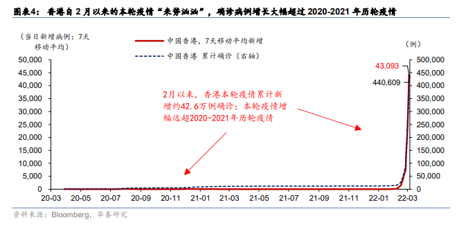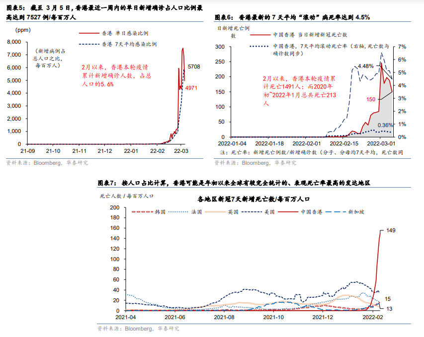香港自2月以来的本轮疫情“来势汹汹”,确诊病例增长大幅超过2020-2021年历轮疫情。3月5日,香港当天官方公布新增确诊37,529例、此前连续3天的日新增确诊在5万人以上、连续8天新增确诊超过3万人(图表4);最近一周内,香港官方公布的日新增确诊最高达到56,827例(3月3日),较2月下旬(2月20日)跳升9.4倍。2月以来,香港本轮疫情累计公布新增确诊42.64万例,占总人口的5.6%、是此前各轮疫情累计确诊人数总和的30倍——考虑到香港近期才开始考虑将自测阳性纳入确诊统计,而此前或有相当数量的无症状患者未进行检测、轻症自测阳性未纳入官方的确诊统计,实际感染人数可能更远高于此。