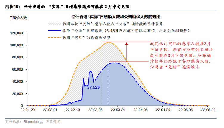 但我们认为官方公告的日增确诊数可能“滞后”至3月下旬见顶、晚于“实际”感染数,高点也将低于实际感染数——鉴于核酸检测和快速自测覆盖率的提升需要一定时间,且漏报和轻症患者不上报的可能性依然存在。但随着检测力度逐渐加大,实际感染数和公告确诊数的差异将逐渐缩小