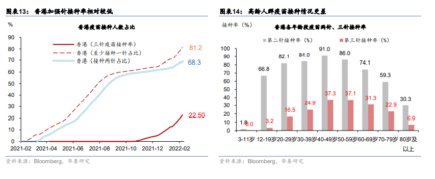 根据香港政府统(https://www.covidvaccine.gov.hk/pdf/5th_wave_statistics.pdf),截至3月5日,本轮疫情当中,香港新冠病亡的80岁以上老年人,占总病亡人数的68.7%。同时,本轮疫情青少年和儿童并不完全与死亡“绝缘”——截至3月5日,12岁以下青少年累计有4例病亡,成为“痛点”。今年1月底,香港至少接种一针疫苗的人口占比为71.4%、接种两针疫苗的占比为64%、接种过三针疫苗(加强针)的占比为12.6%;截至3月初,三项数据依次为78.4%、68.1%、19.3%。欧洲国家、以及韩国的加强针接种率普遍超过5成,而香港相对较低,高龄人群疫苗接种情况更差。香港80岁及以上老人完成两针疫苗接种的比例仍只有3成、三针接种的比例只有7%。相比之下,20-70岁群体的两针疫苗接种率则超过了7成